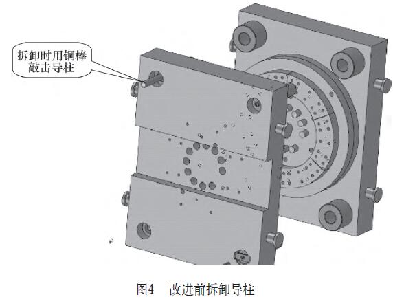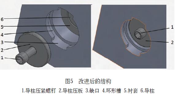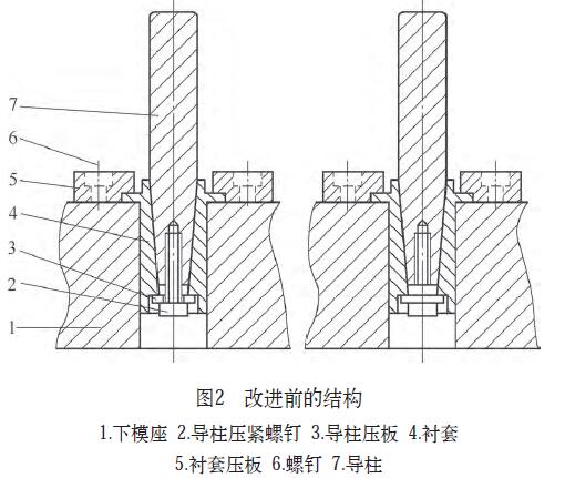 通常在拆卸導柱時,先用內六角扳手將導柱壓緊螺釘拆卸、取出導柱壓板,然后用銅棒敲擊導柱下平面,使導柱與襯套分離,取出導柱(見圖1~圖4)。