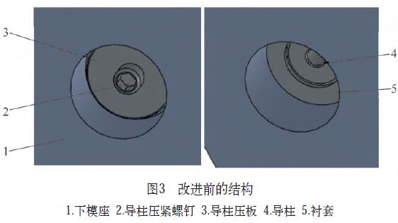 大型電機模具每沖裁5萬片時需要對模具上、下模刃口用平面磨床進行刃磨,以保持模具刃口鋒利,進而保證沖片質量。在刃磨下模刃口時,由于導柱高于下模刃口面,必須將導柱拆卸后再刃磨。本改進對導柱拆卸方法進行了改進,可節約拆卸導柱時間92%,模具刃磨時間僅為原來15%。在節約時間的同時,操作安全性也大幅提高。