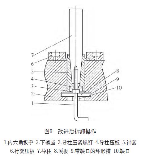 在拆卸導柱時,將頂板從模座導柱孔下方的缺口放入模座的環形槽里,旋轉90°卡在環形槽里,再將內六角扳手通過頂板中心的圓孔將導柱壓緊螺釘擰出(逆時針)。當導柱壓緊螺釘與頂板接觸后,繼續旋轉導柱壓緊螺釘,此時導柱在螺釘的旋轉力作用下,使導柱和襯套分離,導柱拆卸完成,如圖6所示。
