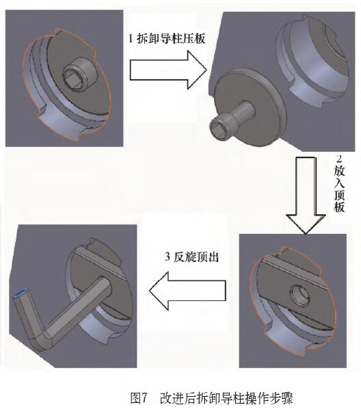 改進后拆卸導柱時,通過反向旋轉導柱,壓緊螺釘就可使導柱和襯套分離,不用對電機模具進行翻轉,并且省略了傳統拆卸時通過敲擊使導柱和襯套分離,從而避免了敲擊導致的對導柱、襯套的磕碰,也避免了敲擊帶來的對操作者安全隱患(見圖7)。通過統計核算,該項改進在大型電機模具模具的全壽命周期內,可節約成本5萬元。每年可為公司創造效益約50余萬元。